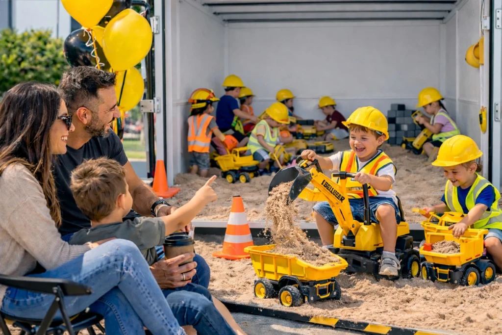 Our construction play zone is designed for children ages 2–8. Younger kids enjoy the sensory sand play while older kids love operating the toy excavators and construction vehicles.