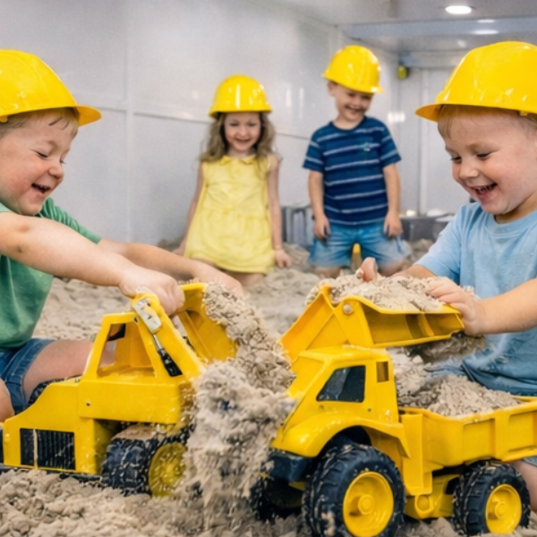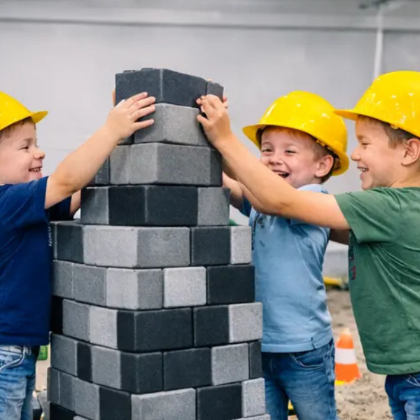 Every child becomes part of the construction crew with hard hats and a full construction-themed play environment. It’s a hands-on experience that combines creativity, teamwork, and active play.