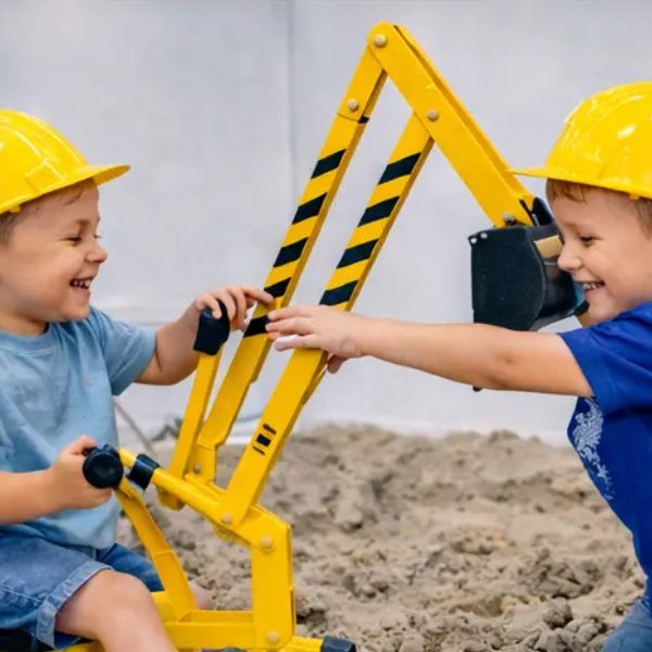 Kids climb onto our kid-sized excavators and dig into the sand just like real construction operators. With dump trucks and bulldozers nearby, they can scoop, load, and transport sand around the trailer while working together on their construction site.