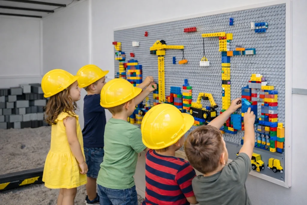 Our LEGO-style Builder Wall gives kids a place to design cranes, towers, and construction scenes using colorful building blocks. This activity encourages problem-solving, imagination, and collaborative play.