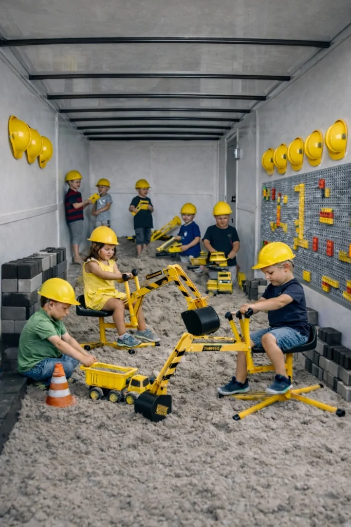 Once the trailer doors open, kids enter their own construction playground. They can dig with excavators, drive dump trucks, build with foam bricks, and design creations on the LEGO Builder Wall.